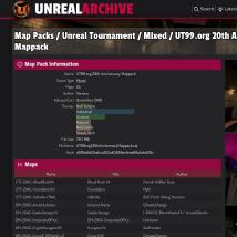 Unreal Archive is an initiative to gather up, index, and catalogue as much Unreal, UT99 and UT2004 (and hopefully soon Unreal Torunament 3) content as possible. So far, we have maps, map packs, voices, skins, mutators, player models, as well as support for things such as patches, updates and drivers as well as a (currently very empty) section for written documents with the intent of providing guides, tutorials, manuals, and other related documented knowledge which also seems to get lost and forgotten.